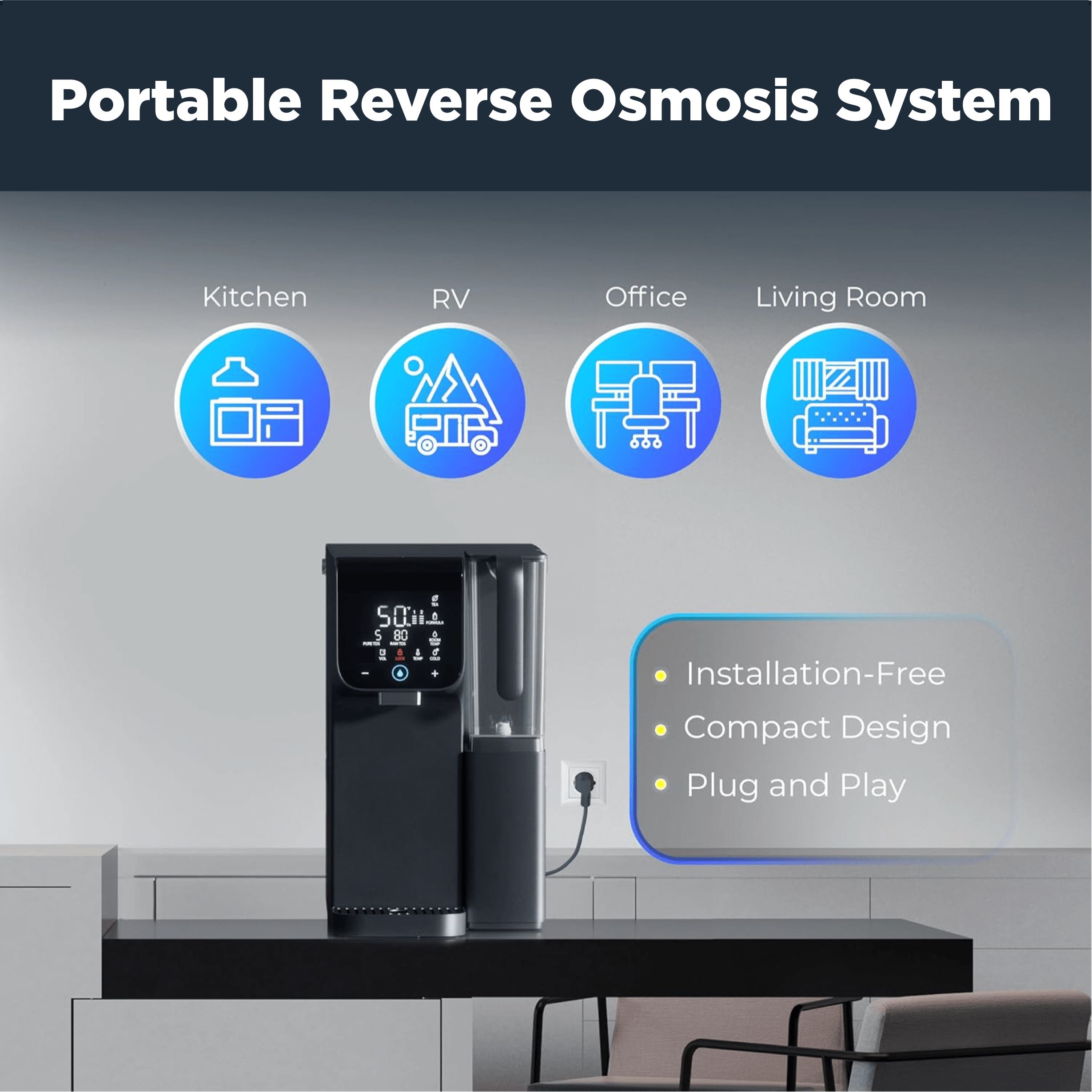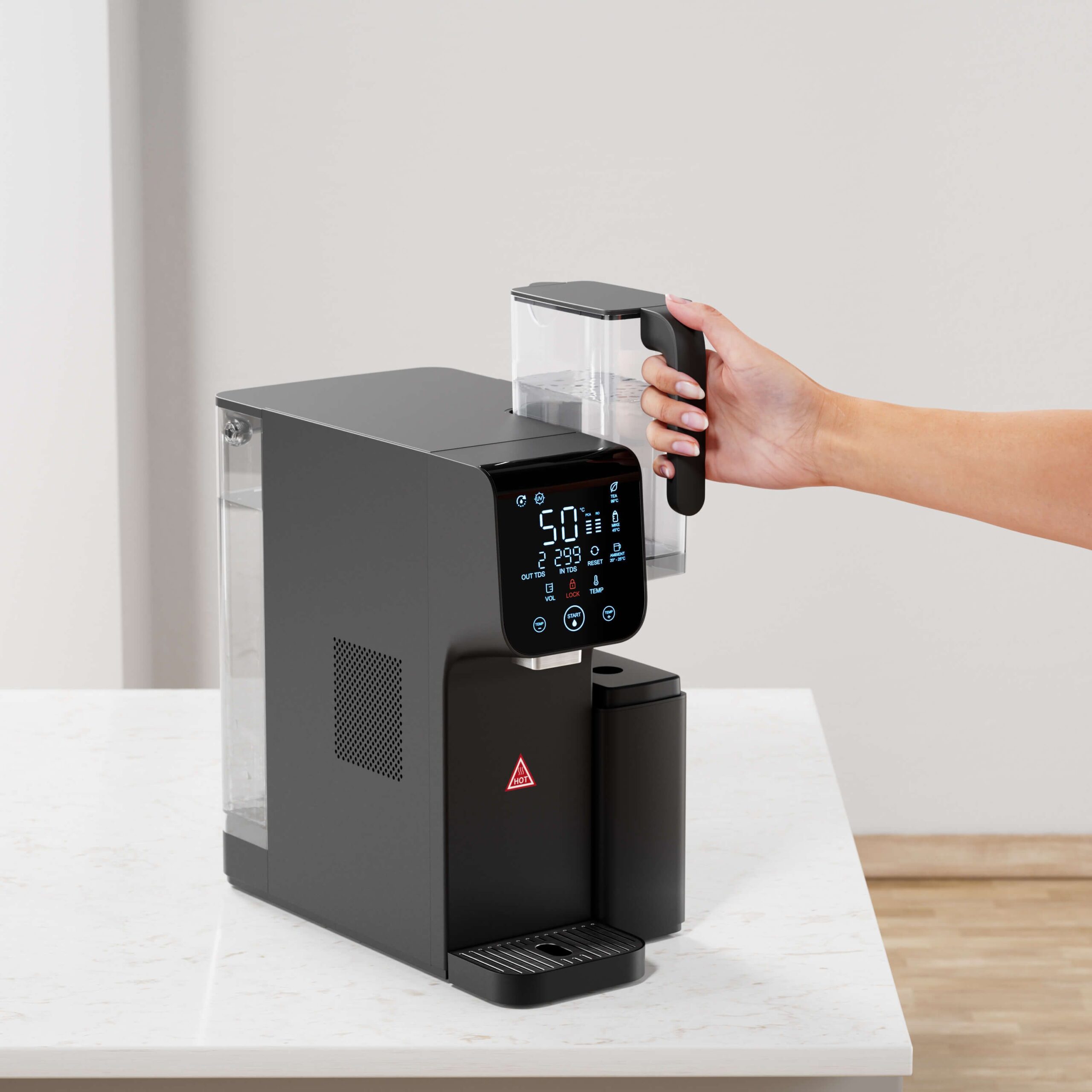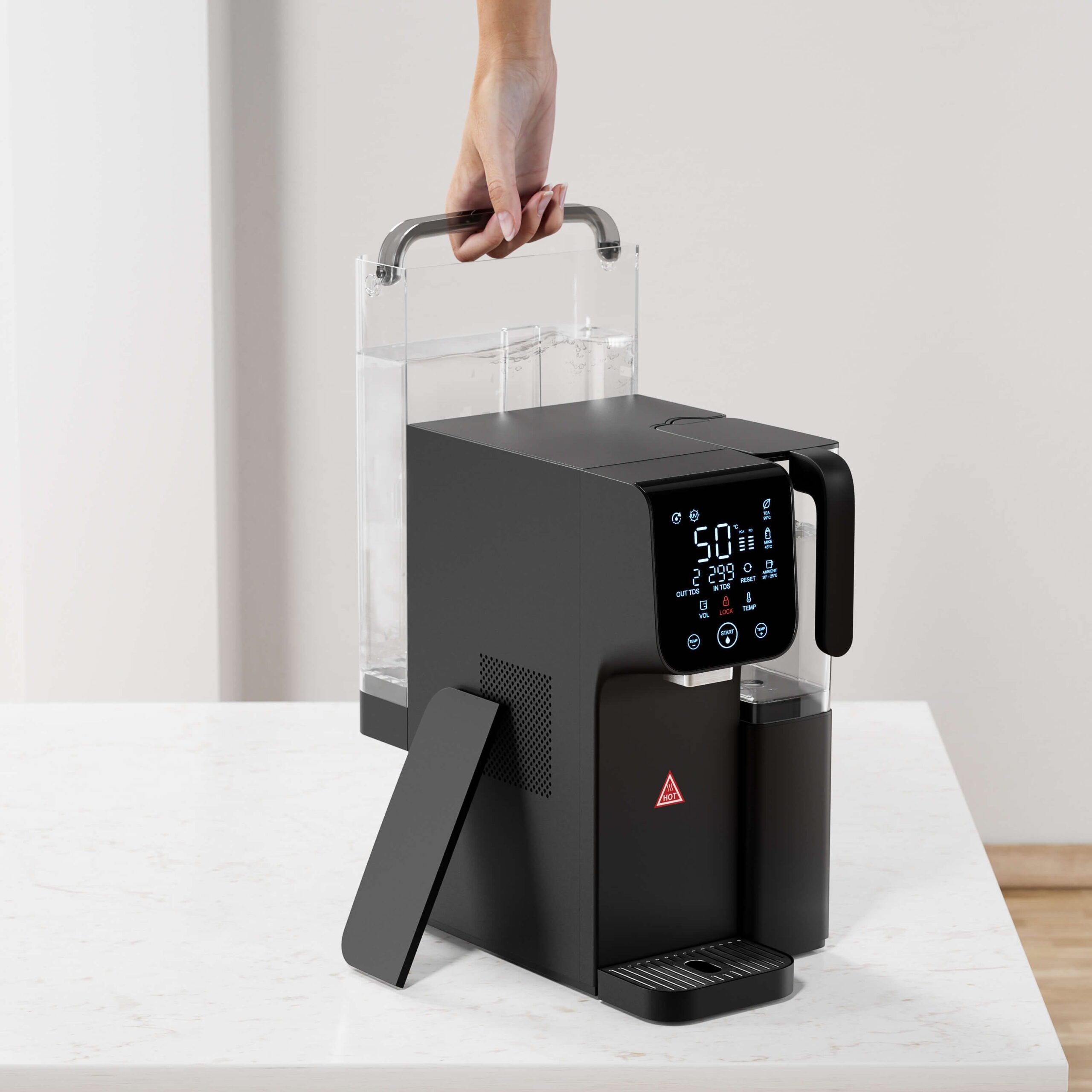 • Nešiojamas ąsotis su RO vandeniu – galite pasiimti švarų vandenį bet kur, net į šaldytuvą, kad gautumėte šaltą geriamąjį vandenį.