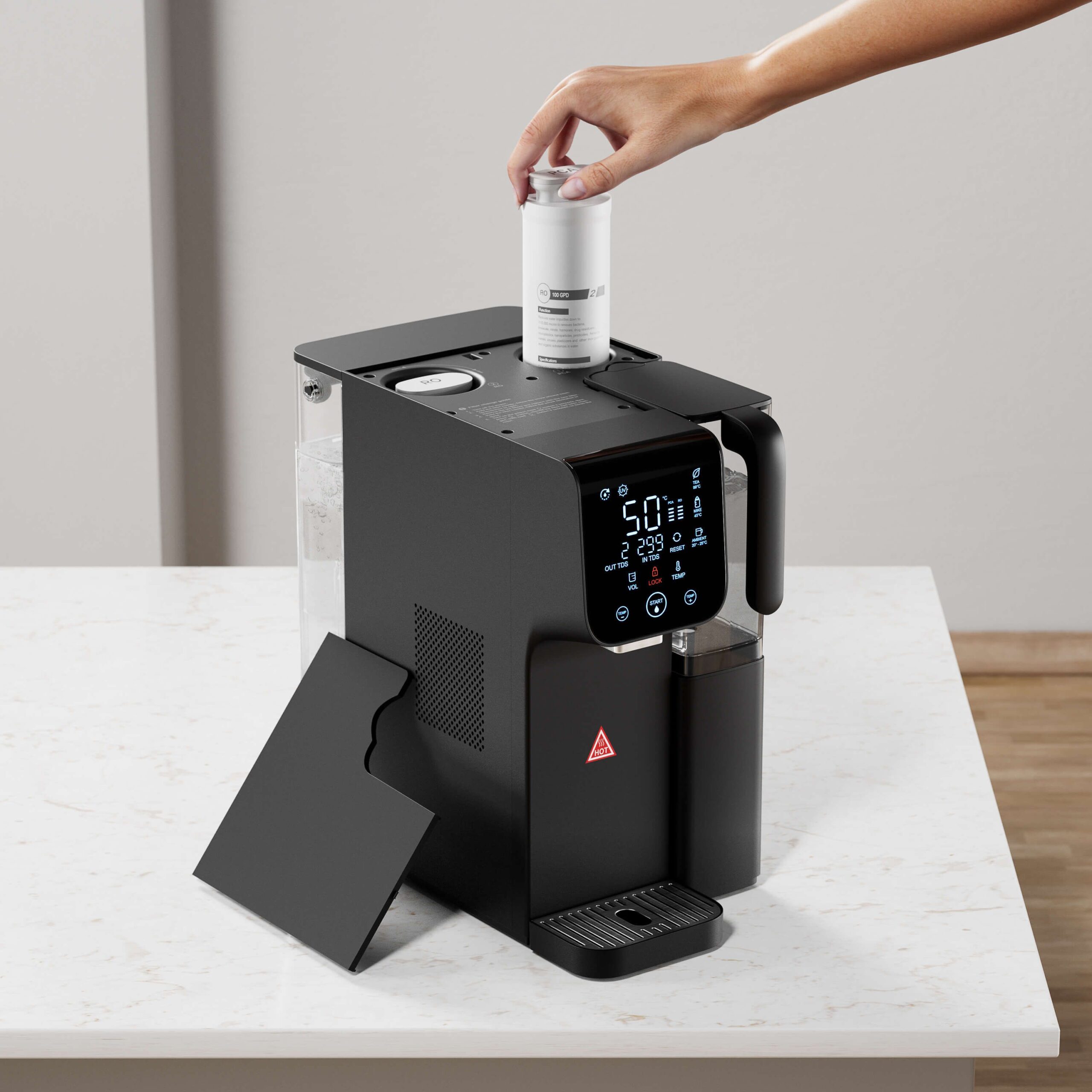 • Jutiklinis ekranas rodo realaus laiko TDS (ištirpusių kietųjų dalelių) rodmenis, filtrų būklę ir vandens kokybę.
